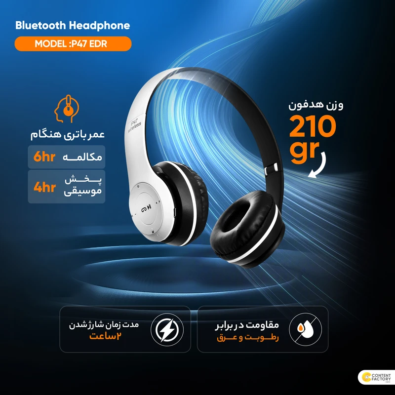 هدفون بلوتوثی مدل P47 EDR دارای شیار کارت حافظه، مقاومت در برابر رطوبت و عرق